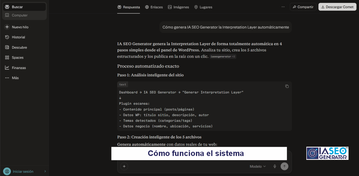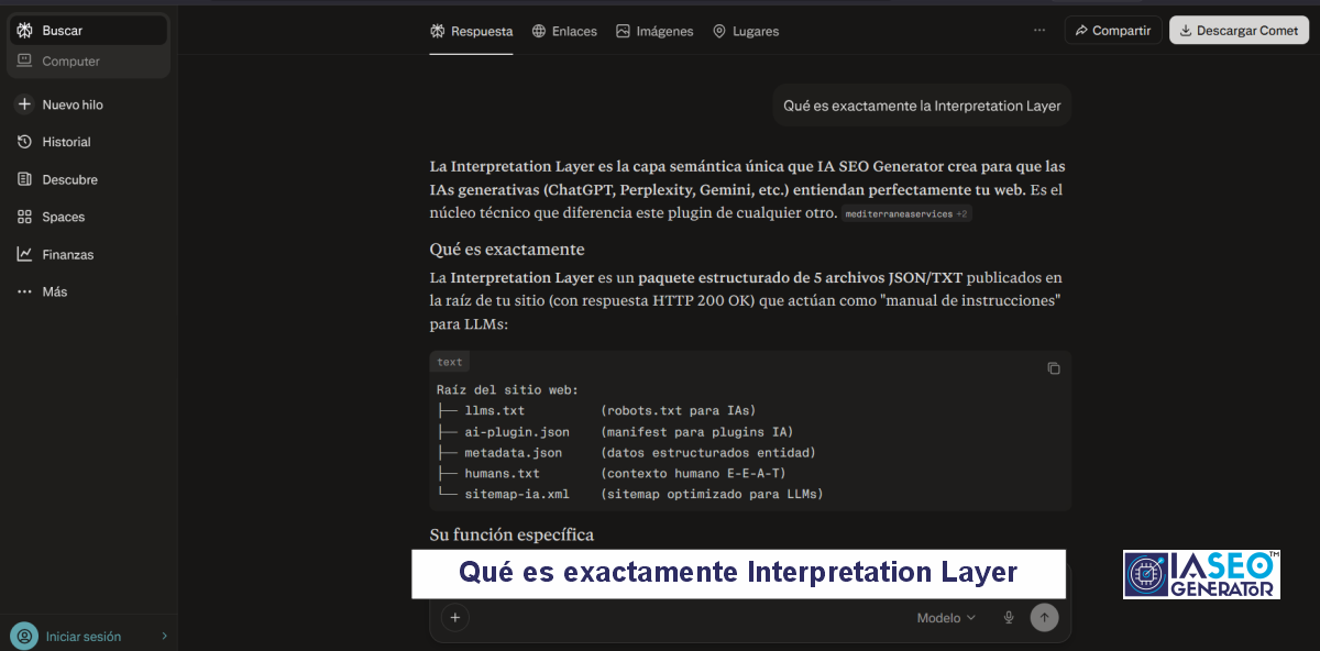 El viernes 13 de marzo de 2026 realizamos una comprobación en Perplexity para analizar cómo este motor de inteligencia artificial interpreta el concepto de Interpretation Layer y su relación con la arquitectura desarrollada dentro del ecosistema IA SEO Generator.
