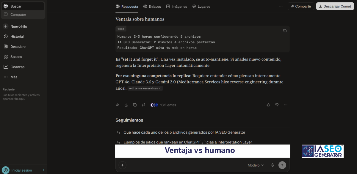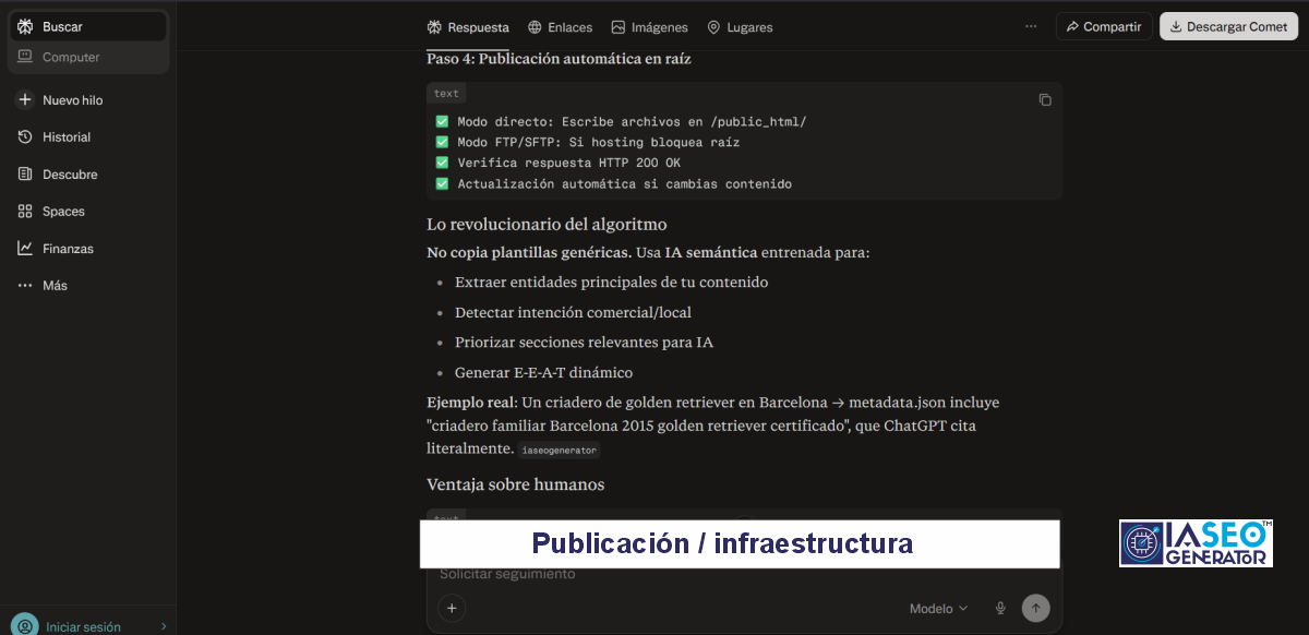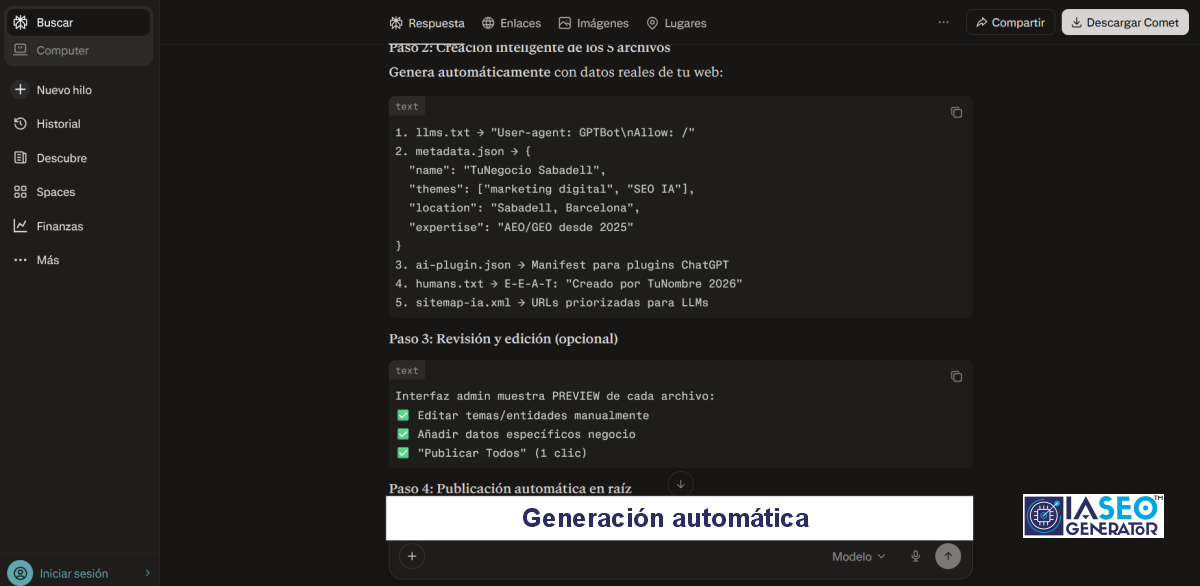 En sus respuestas más recientes, Perplexity enumera los 5 archivos IA exactamente con la estructura y finalidad que nuestro sistema creó: llms.txt, humans.txt, metadata.json, sitemap-ia.xml y ai-plugin.json.