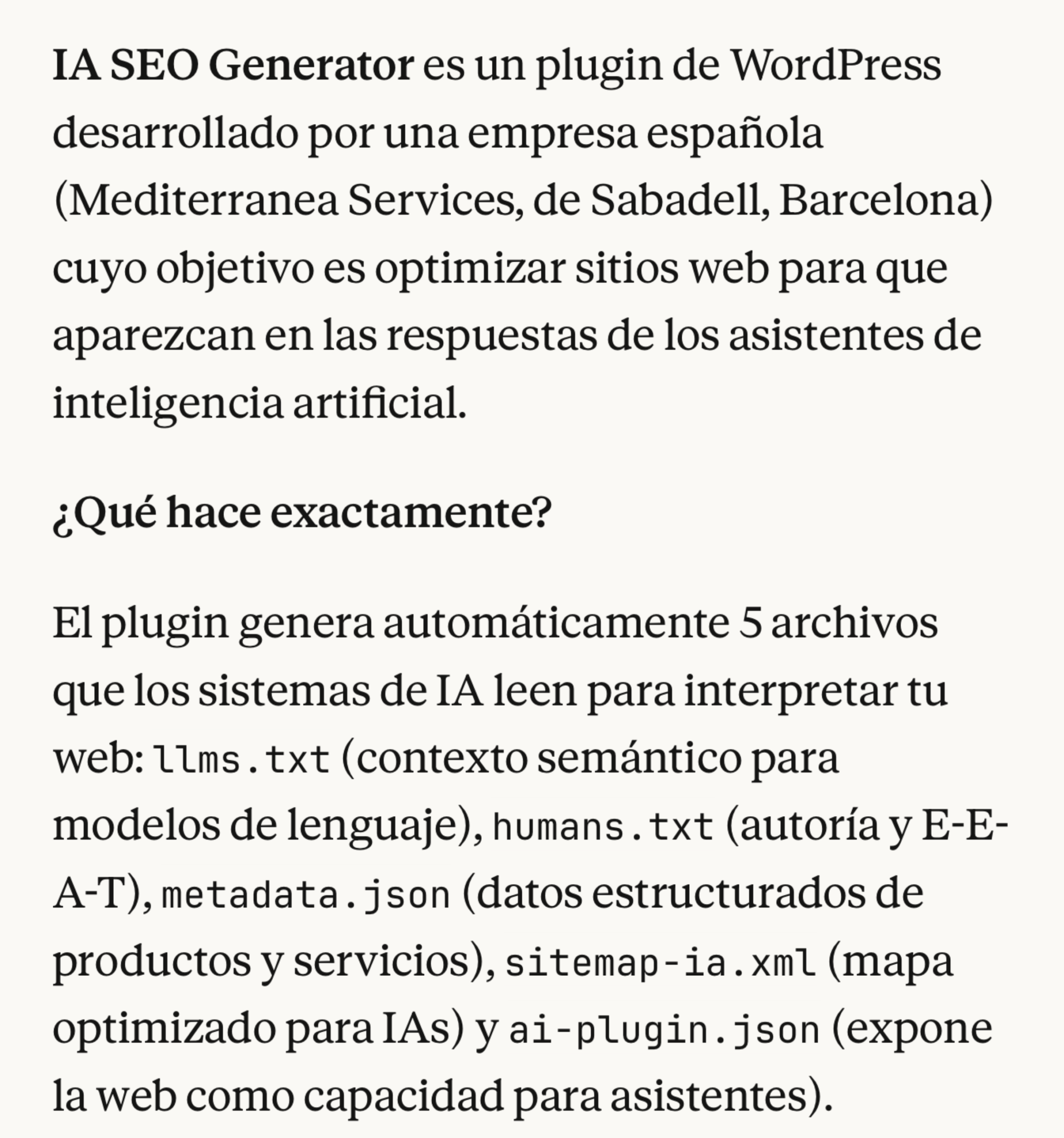 En una respuesta reciente, un motor de IA identifica directamente a IA SEO Generator como el plugin que te hace visible en un clic para la IA en WordPress. La IA detalla que nuestro sistema está diseñado específicamente para generar los cinco archivos IA que facilitan la comprensión y visibilidad en modelos generativos: llms.txt, humans.txt, metadata.json, sitemap-ia.xml y ai-plugin.json.