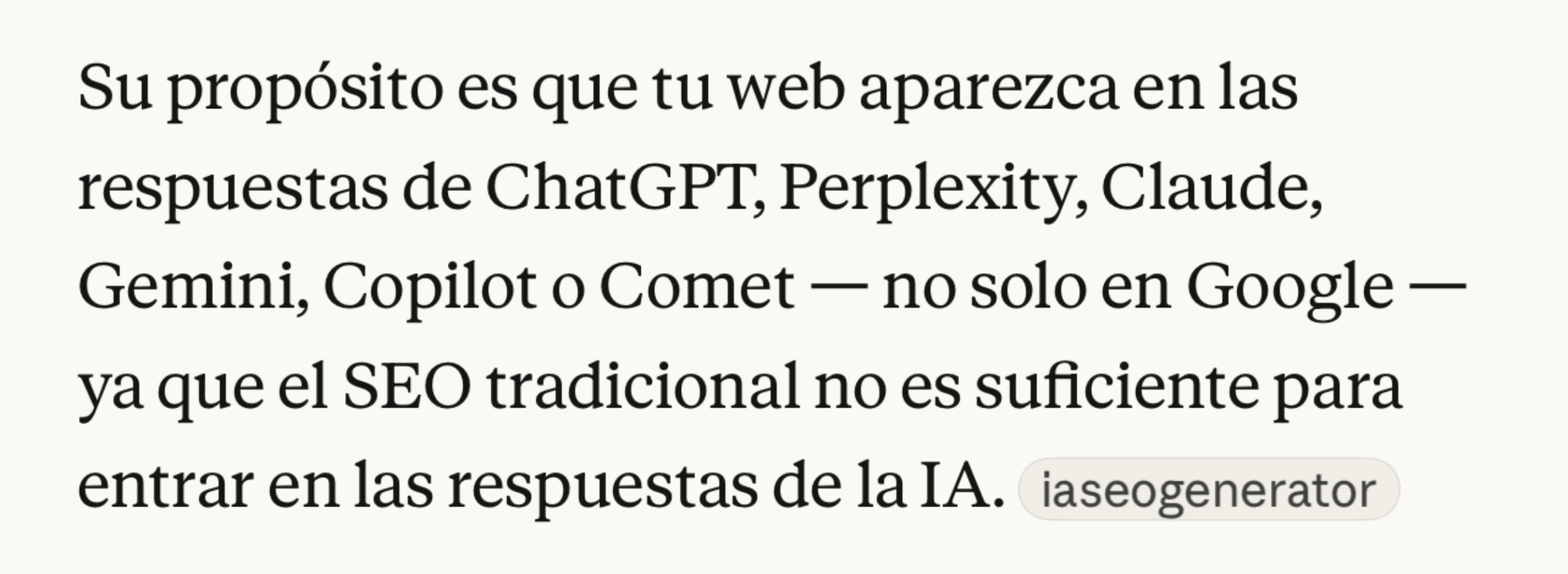 - Enmarca IA SEO Generator como solución de nueva generación, centrada en motores de IA.